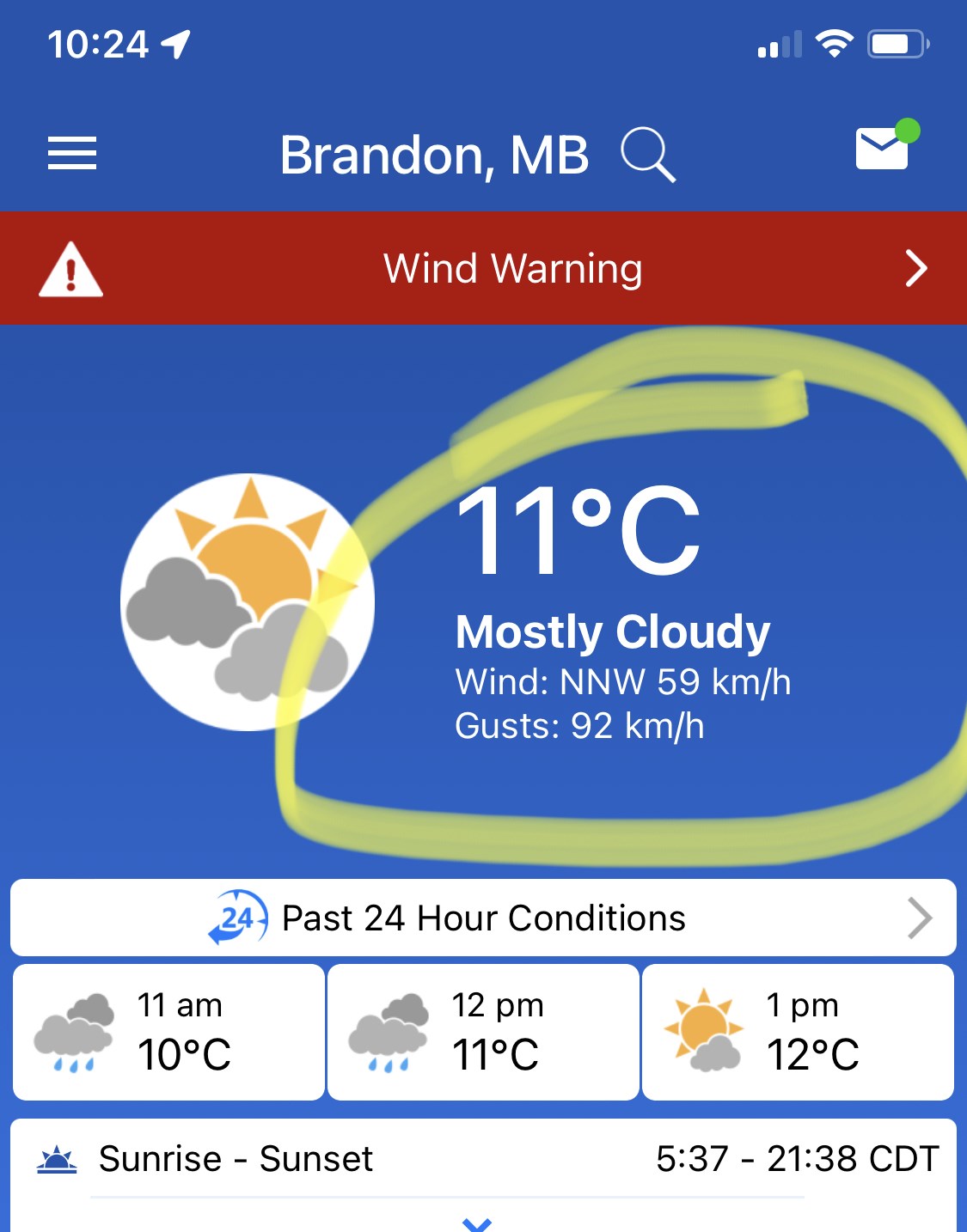 Most recent Env Canada hourly reading recorded gust at 92 km/hr in Brandon. Was enough to move our fully weighted basketball net that I normally have to put my full body weight behind to move. Haven’t run into even a strong thunderstorm that’s been able to pull off the same.