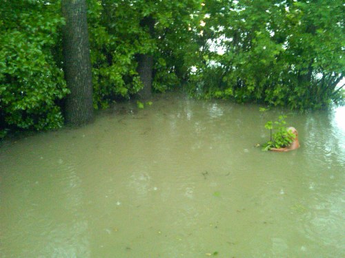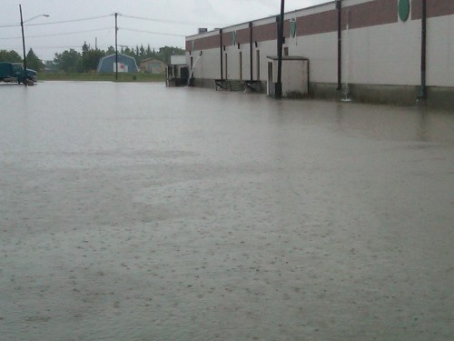 I thought I'd post a few pics of my backyard and my street after the downpour in Boissevain this afternoon! I am not sure exactly how much rain we got...but a few more feet and it would have been up to my house! The dog was having fun! LOL