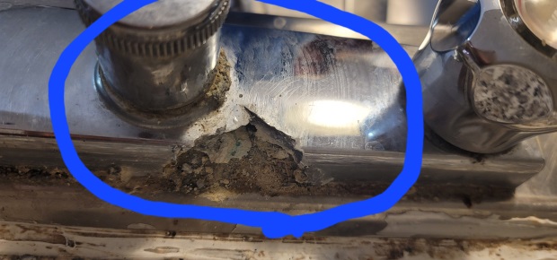 The picture below shows my kitchen tap from the back in the middle where the faucet is ( not back of valves). Seems no problem of leakage now. Just wondering if the corroded part can be just cleaned and filled with kaulking or something or the whole kitchen faucet needs to be changed to a new faucet?