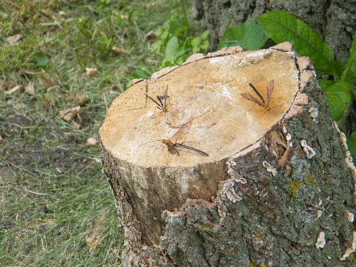 i was outside yesterday and see these bugs on a tree stump and i have no idea what they are at first i thought they were dragon flies of some sort but i dont think that is what they are. when one flew away its tail on it was at least 4 cm long and they are ugly. anybody know what they are