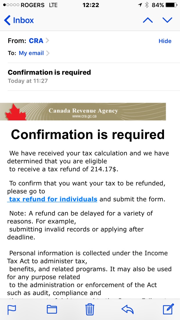 I received this email this morning from the "CRA" about a tax refund I apparently have.