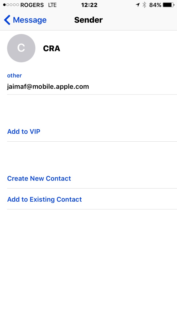 When I click on the email address that this message came from its jaimaf@mobile.apple.com. That does not seem like an email address that something from the CRA would come from.