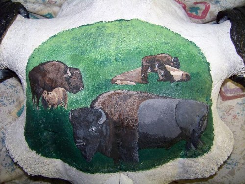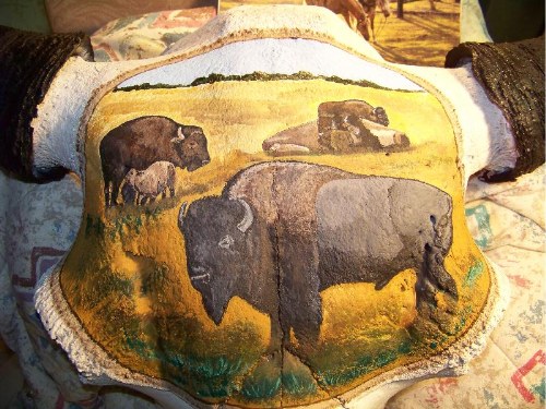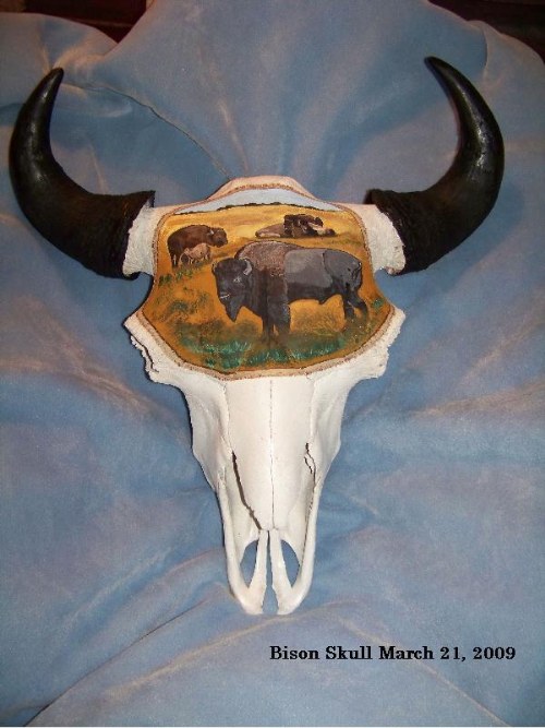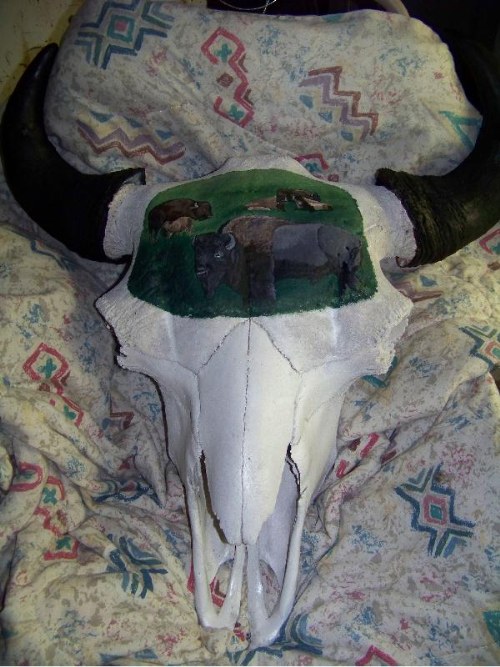 I have been working most of the day today painting a scene on a bison skull and thought I would share it with you … hoping you can give me some ideas if you think it should be added to, changed (think the grass is too dark?) I am thinking that it needs more of something. It is supposed to be set on the prairies so can’t put mountains in the back ground (which would have been nice, lol). I have thought of a row of trees and sky … but not sure where the sky would end.