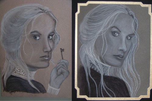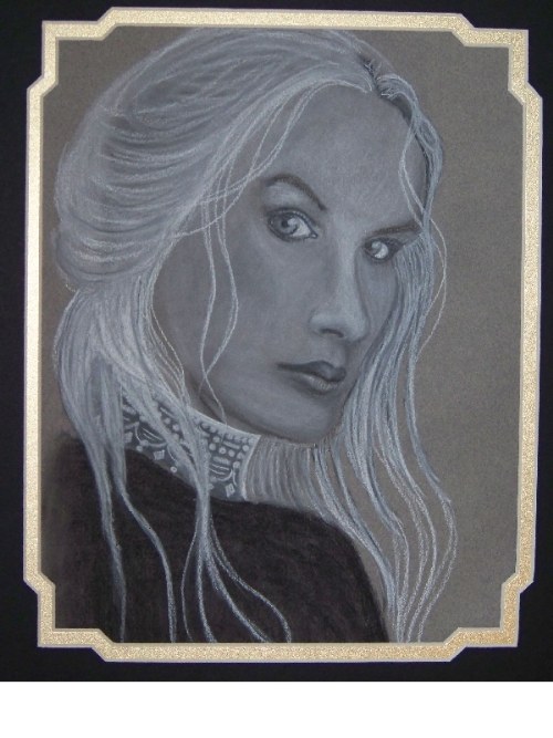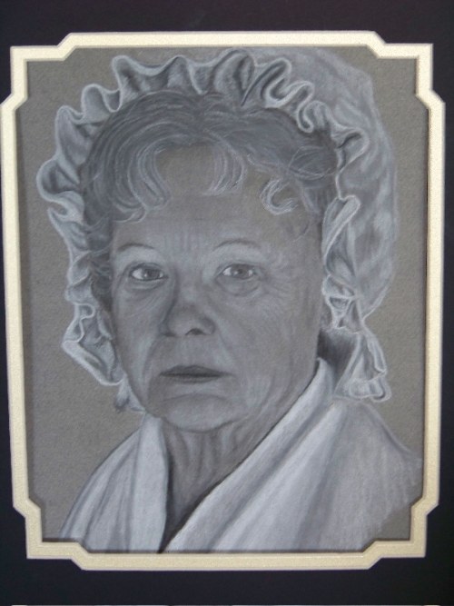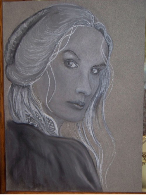 I am getting pictures ready for the Souris Art show at the end of this month and thought to do a series of portraits of the characters in New Beginnings (and sequel)... but I am having trouble with one portrait (I will post a photo). It looked OK before I added the neck and shoulders ... she is looking back but something is really wrong with this. Is there someone out there who has long hair who would offer to pose like the character in the picture and send it to me??? This is the first work I did on paper with a slight brownish tinge to it ... her hand is showing up too grey, compared to her face so will try to work on that.