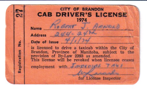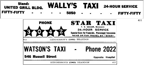 I believe Brandon taxi history began with livery stables back in the 1800s. About ten years ago I was researching Winnipeg cab history and I'm sure I saw two photos of a Brandon livery stable (Drever's?) circa 1914 in Gas Power Age, a very interesting magazine published by the Manitoba auto trade between 1910 and 1914 (a run of GPA issues is held by the Legislative Library in Winnipeg). In one photo a horse cab was parked out front and in the other a new car. I just looked through my old notes and, sorry, I don't have a page or date. I could kick myself when this happens. You'll likely find cab ads in old Henderson's Directories up to the 1930s but I found that Henderson's Winnipeg Directory dropped classified listings for taxis about 1935, probably because the companies didn't advertise in the HD, they advertised in the telephone book. I'm glad to hear Bourbonman and others are taking an interest in Brandon taxi history. Taxis are such an essential part of the urban scene but their history is sadly negelected. Hopefully this is changing. I recently heard that a living history museum in Edmonton is planning to recreate an old 1920s taxi office there. I'll keep an eye out and if I come across any Brandon taxi info at this end I'll post it here. Good luck and best wishes.